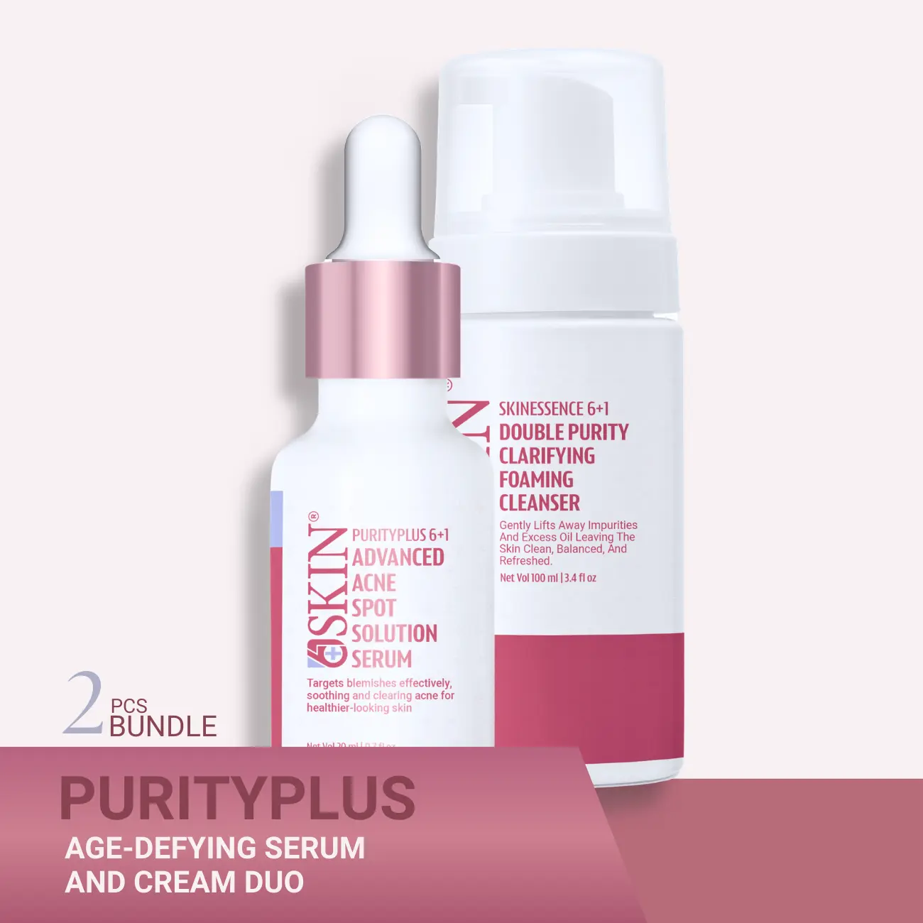 The PurityPlus Acne Starter Duo is a targeted 2-step acne care routine designed to gently cleanse the skin while actively treating acne and blemishes.