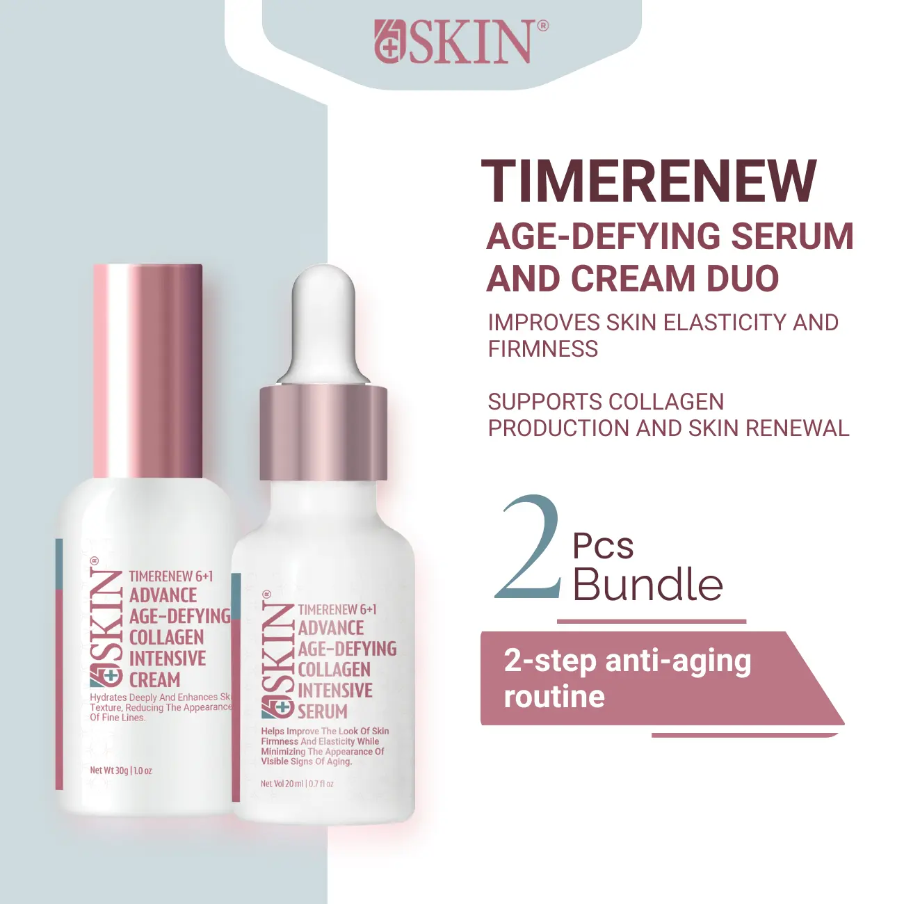 The TimeRenew Collagen Age-Defying Duo is a powerful 2-step anti-aging routine designed to visibly improve skin firmness, elasticity, and smoothness.Formulated with the 6Plus1Skin TIMERENEW Duo Peptide, this serum-and-cream combination works synergistically to reduce the appearance of fine lines and wrinkles, enhance skin structure, and restore a youthful, radiant glow. The lightweight serum penetrates deeply to target aging at its source, while the intensive cream seals in hydration and reinforces the skin barrier for long-lasting results.