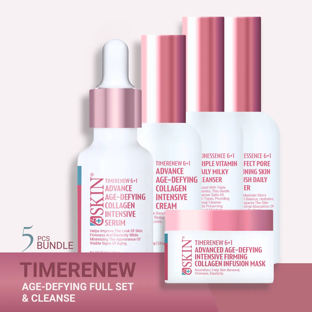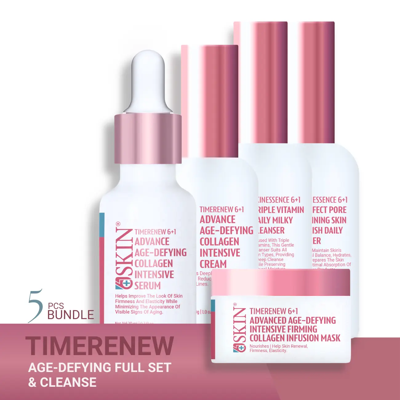 This 5-step routine combines gentle daily cleansing, skin-balancing toning, and advanced collagen-boosting treatments to improve firmness, elasticity, hydration, and overall skin texture. Powered by the 6Plus1Skin TIMERENEW Duo Peptide, the system targets fine lines, wrinkles, and dullness while restoring a youthful, radiant complexion.